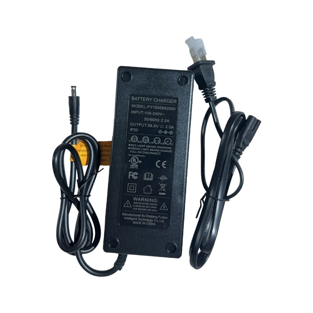 The reliable power companion for keeping your e-bike ready for action. Designed to optimize battery health, this charger delivers a steady 2.0A current, ensuring a safe and efficient charging process every time. Whether you’re preparing for a daily commute or a long weekend adventure, our charger quickly powers up your 52V battery, so you spend less time waiting and more time riding. Compact and durable, it’s perfect for home use or on-the-go, fitting easily into your bag or bike rack. With advanced safety features like overcharge protection and temperature regulation, the 52V 2.0A Smart Charger is engineered to extend battery life while giving you peace of mind. Power up your ride with confidence!